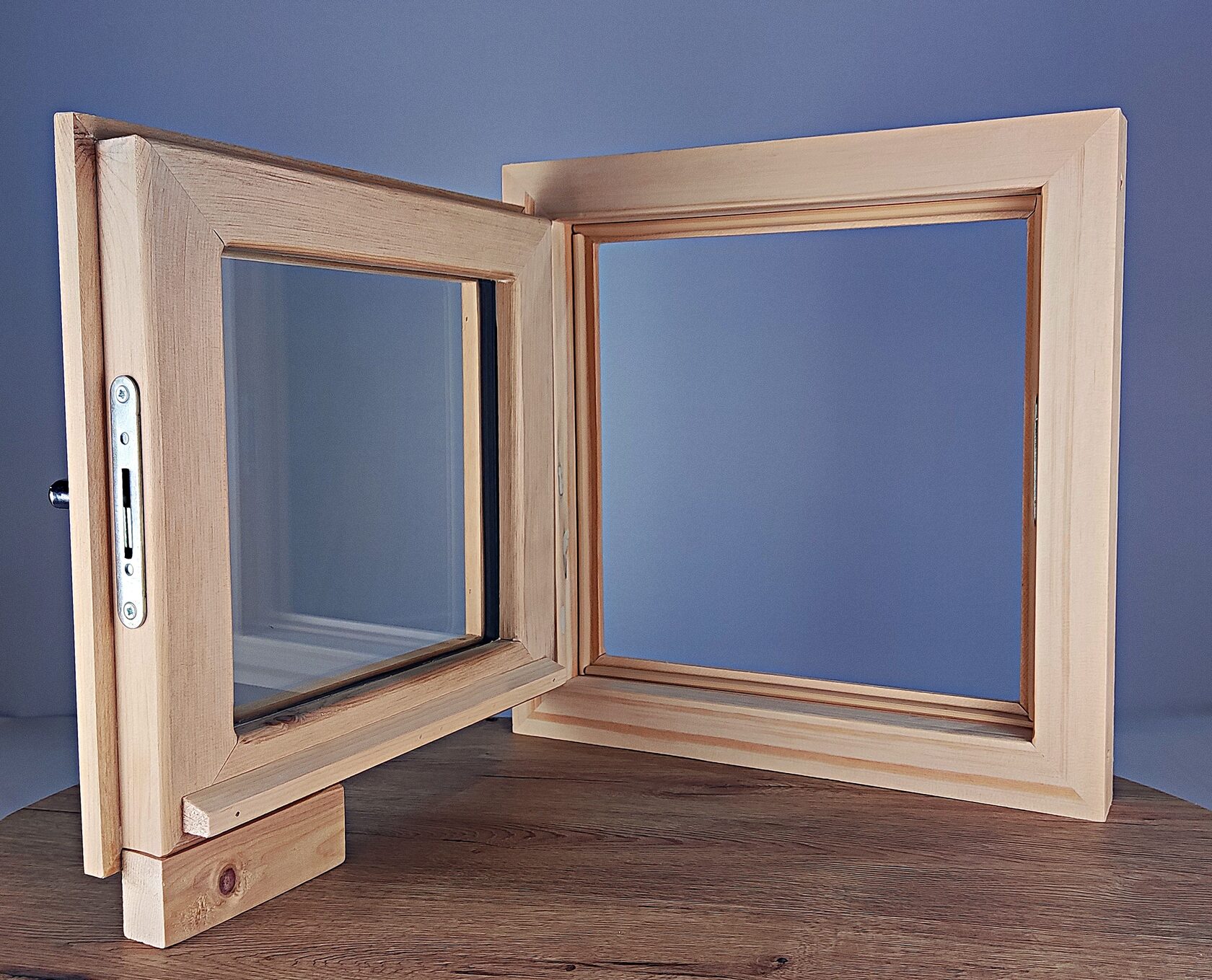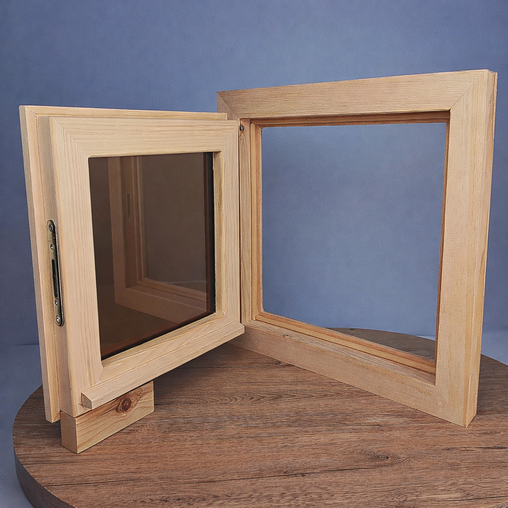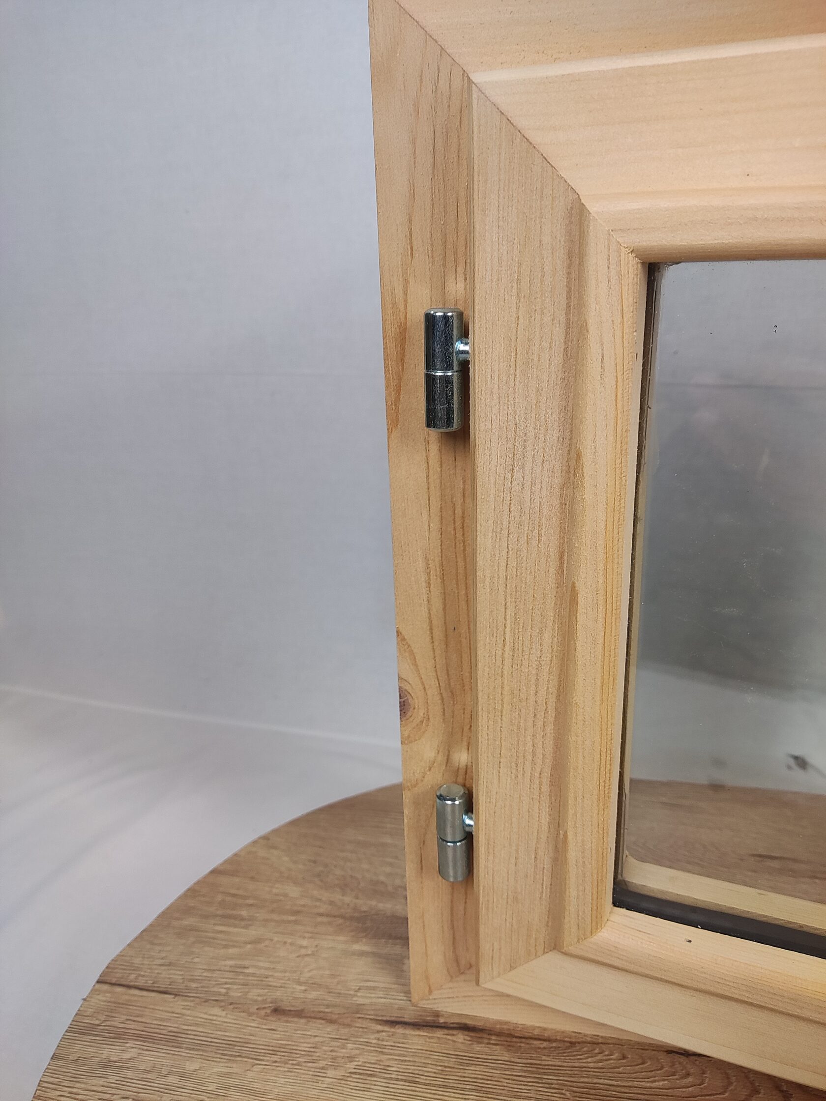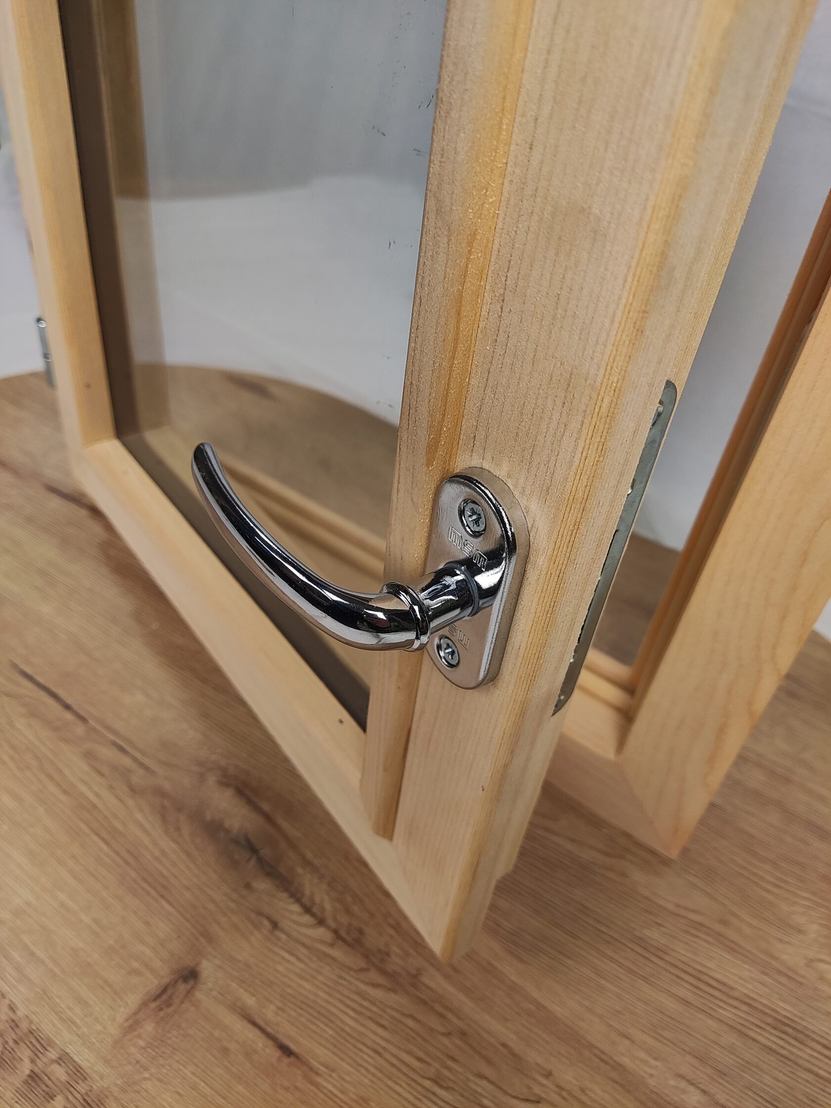 Качественная и стильная фурнитура. В комплекте ручки, навесы, замок. Окно сразу готово к пропитке и установке.
